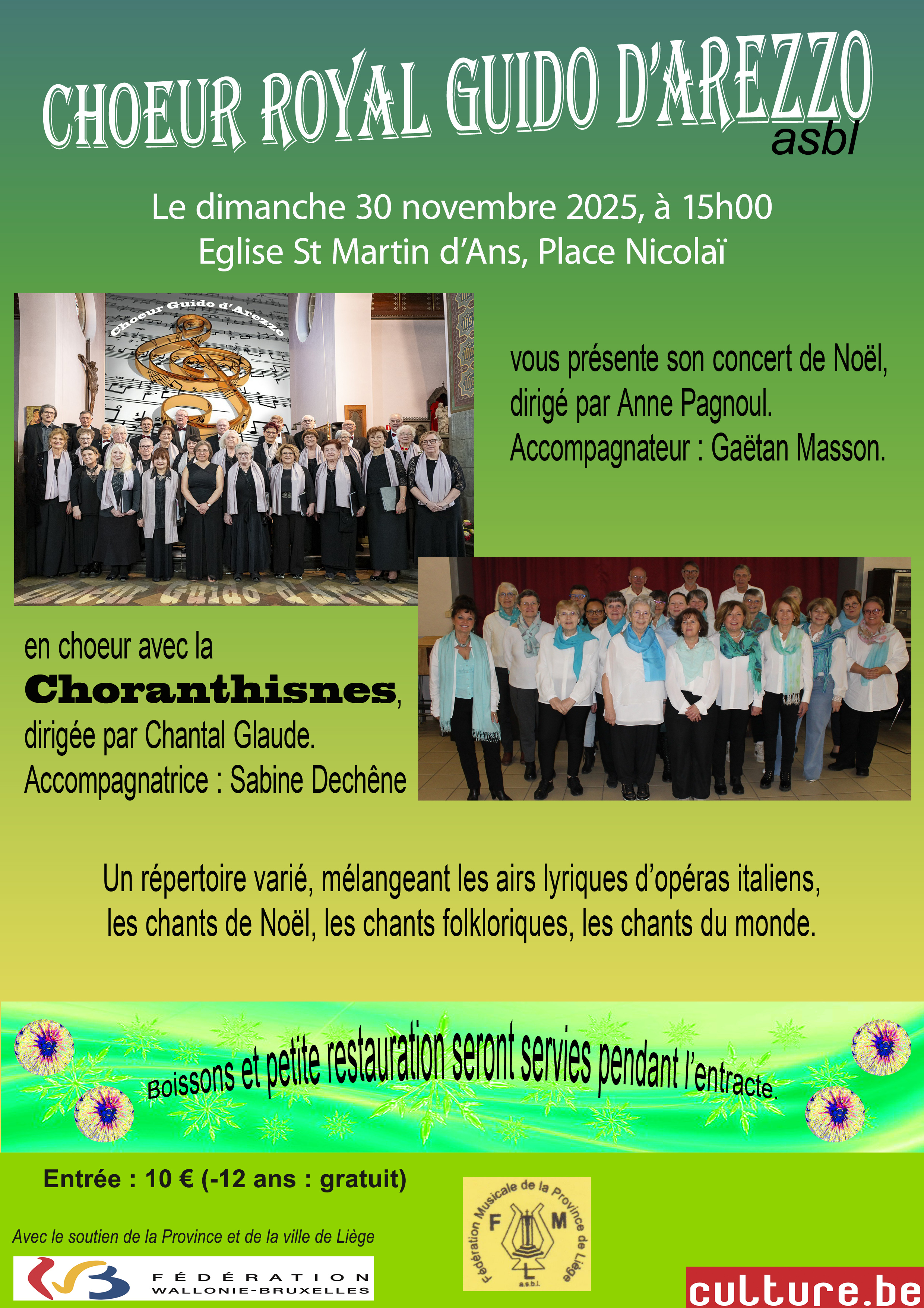 Concert de pré-Noël proposé par le Chœur royal Guido d'Arezzo asbl, accompagné de la chorale "la Choranthisnes" d'Anthisnes.